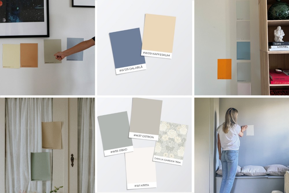 På alla våra stilar och stilförslag kan du köpa färg och tapetprover. Färgproverna är handmålade på ett självhäftande dekalpapper, superenkla att flytta runt för att du verkligen ska kunna se slutresultatet. Du kan köpa enskilda färgprover, färgprover på en hel palett eller färgprover på en färdig färgsättning.