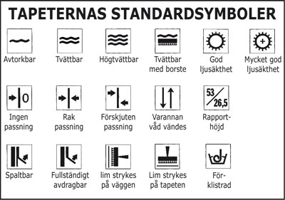 Tips! Alla tapetrullar har en etikett som förklarar hur tapeten ska sättas upp. Det här betyder symbolerna: